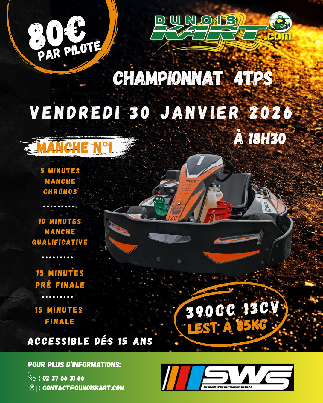 Course de 45 minutes avec une manche chronos de 15 minutes, suivie d'un pré finale de 15 minutes, puis une finale de 15 minutes, sur la piste extérieure de 1200m entièrement éclairée !