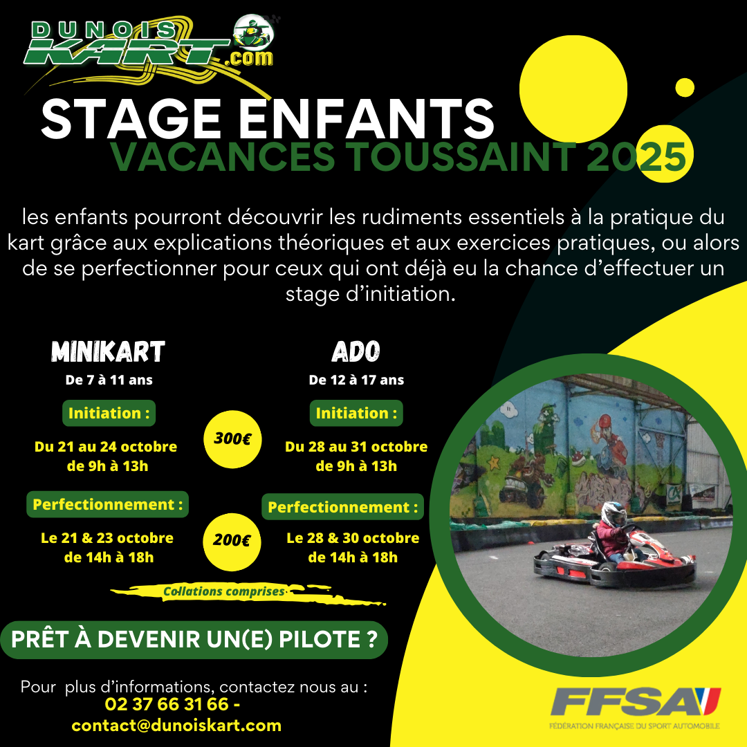 ✅ 2 types de stage : Initiation ou perfectionnement (initiation obligatoire pour un jeune qui n’a pas encore fait de stage chez Dunois Kart)
